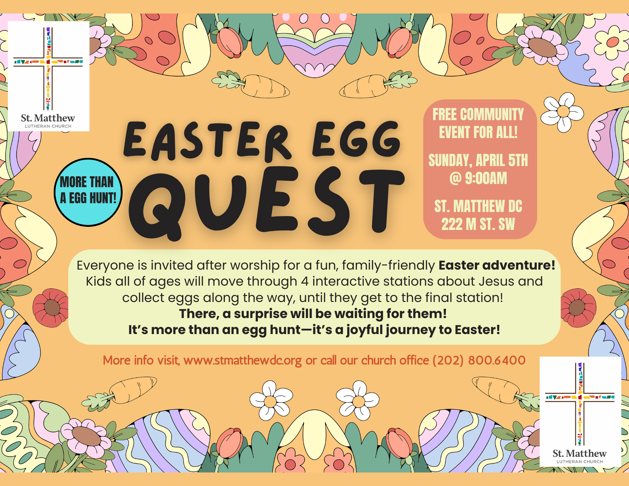 The entire Southwest DC community and beyond are invited to THE EASTER EGG QUEST - a fun and family friendly easter adventure with eggs, candy, healthy snacks, and give away easter bags for children. Join us on Sunday, April 5th @ 9am!
